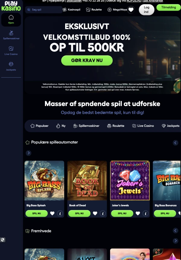 Med PlayKasino kan du få adgang til spilleautomater, roulette, live casino, jackpots og gameshows på mobilenheder. Vores platform indeholder spil fra NetEnt, Play'n GO, Evolution Gaming, Pragmatic Play, Big Time Gaming, Blueprint Gaming, Red Tiger Gaming, Yggdrasil, Microgaming og ELK Studios. I alt giver PlayKasinoCasino adgang til 8600 spil, med RTP-oplysninger vist i reglerne for hvert spil og med forbehold for ændringer.
